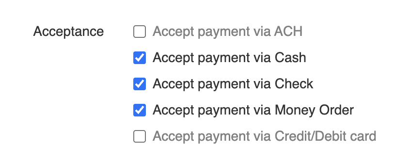 We created settings that allow you to decide whether to accept cash, check, or money order payments. You can find the settings under facility-level Settings > Billing Section > Settings > Acceptance section of Payments.