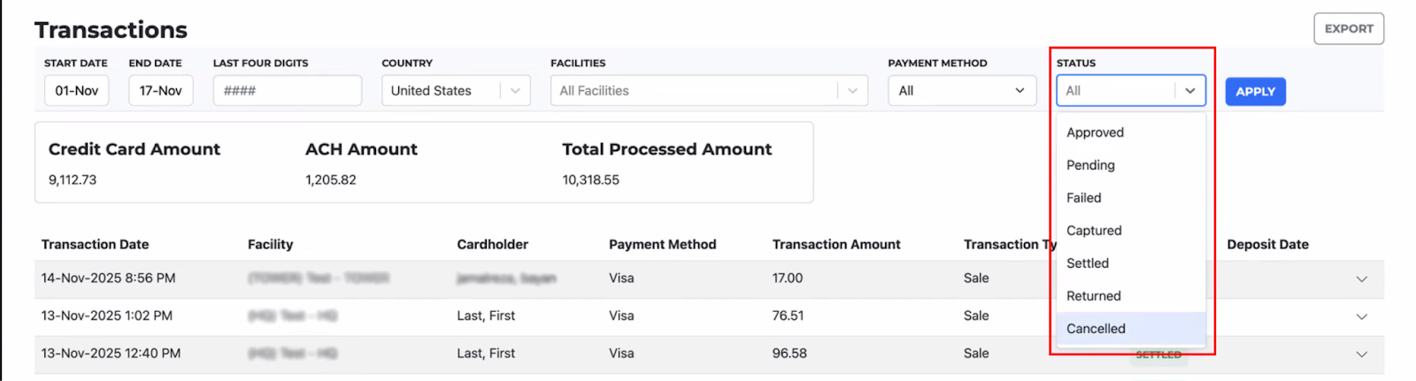 We’ve added a Status filter to the Storable Payments Transactions page. You can now filter transactions by the following statuses: