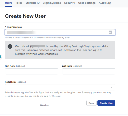 When Storable ID is enabled, users will be added, deleted, and given access to your software from the Storable ID portal. To edit users, log in to the Storable ID Portal directly and click Settings or click New User from your Corporate Settings > Users page in Storable Edge.
