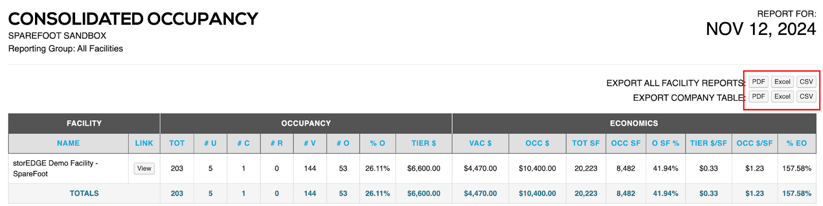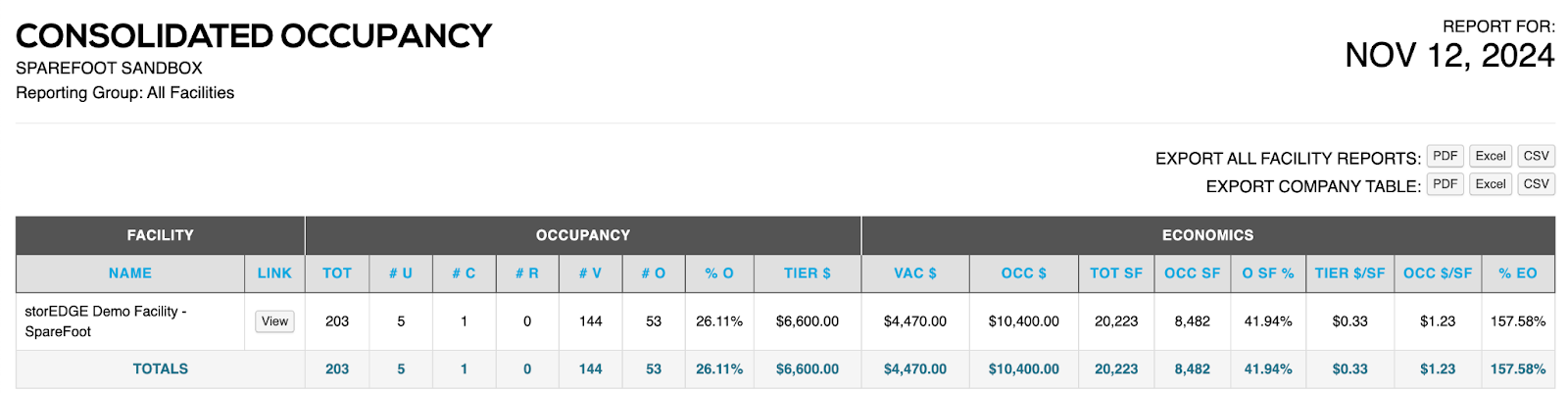 - Export Company Table - This option shows consolidated occupancy at the facility level.