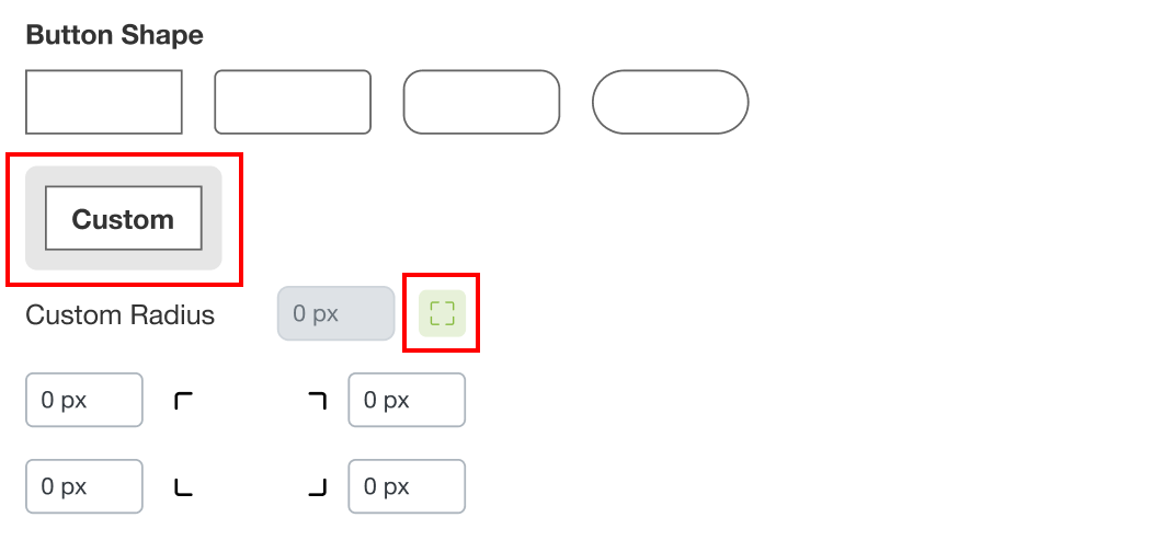 If you’d like to enter a custom corner radius for your buttons, click Custom. Enter the corner radius you would like in pixels. If you want to enter an individual corner radius for each corner of the button, click the green corner button and enter each corner radius according to the diagram.