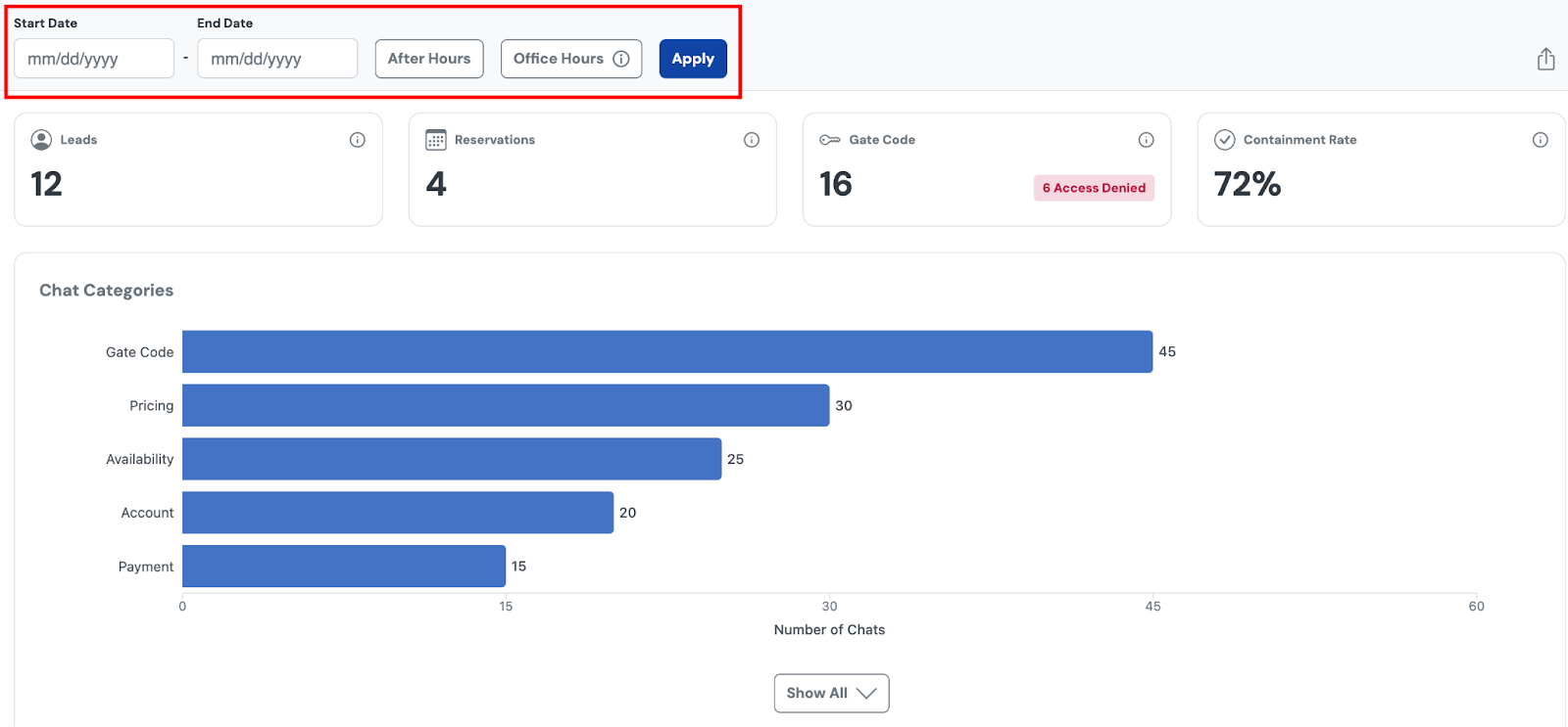 You can select one or more filters: Leads, Reservations, Gate Access Denied, or Support Requests, to filter the chat list by subject.