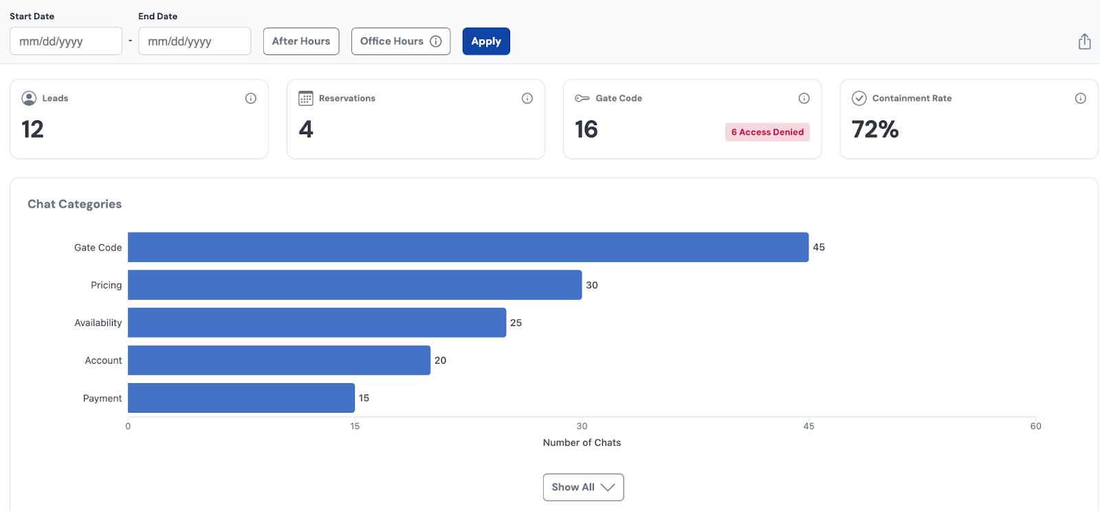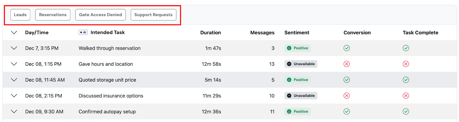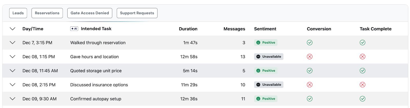 - Leads - The chatbot captured a prospective tenant’s contact information and storage needs for future follow-up by facility staff.