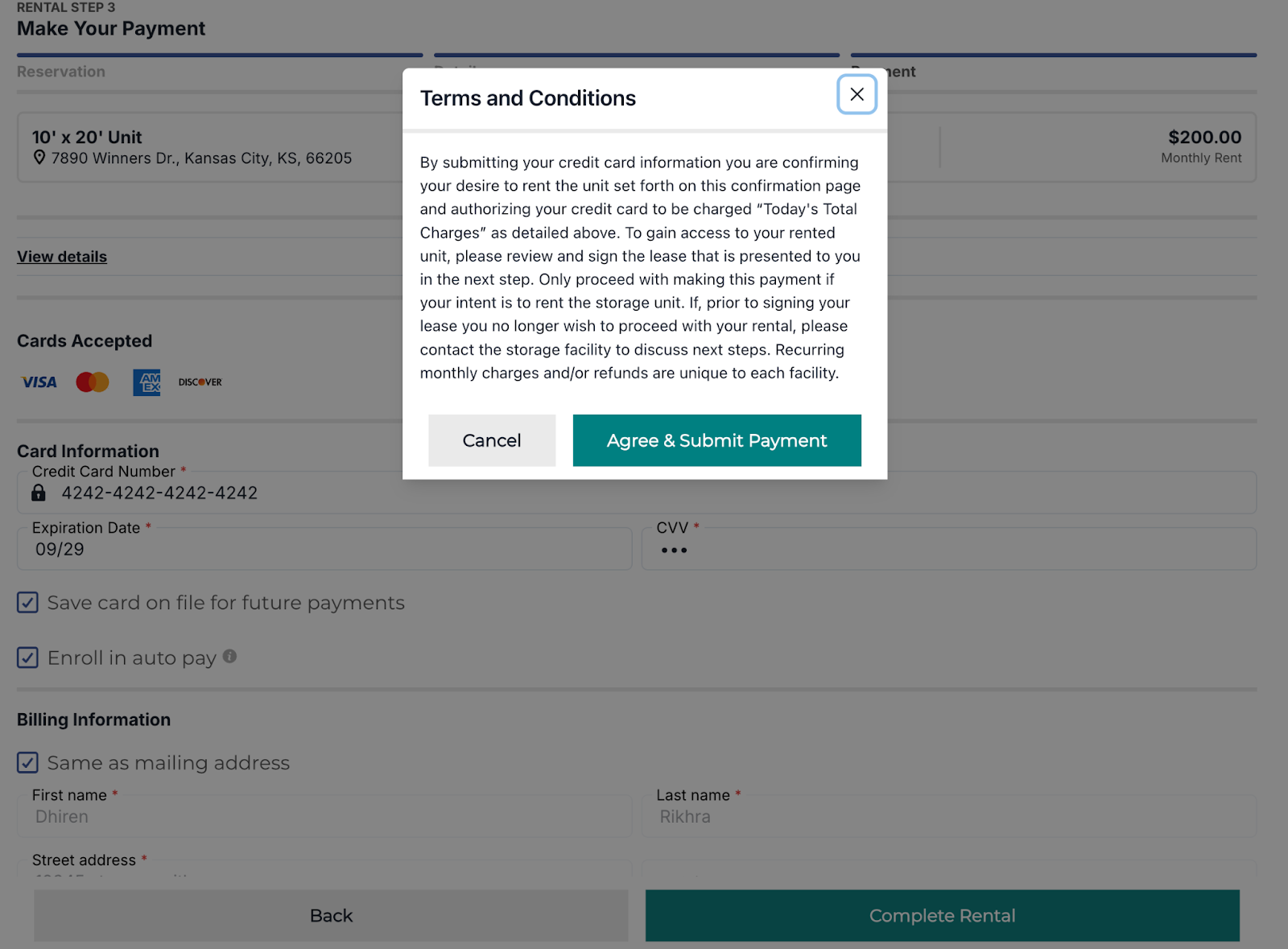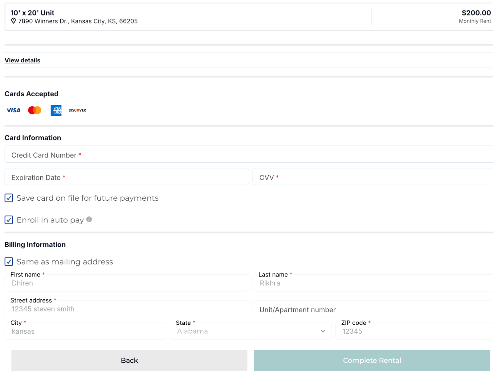 The customer will then provide payment details, verify their information, and click Complete Rental if everything looks good.