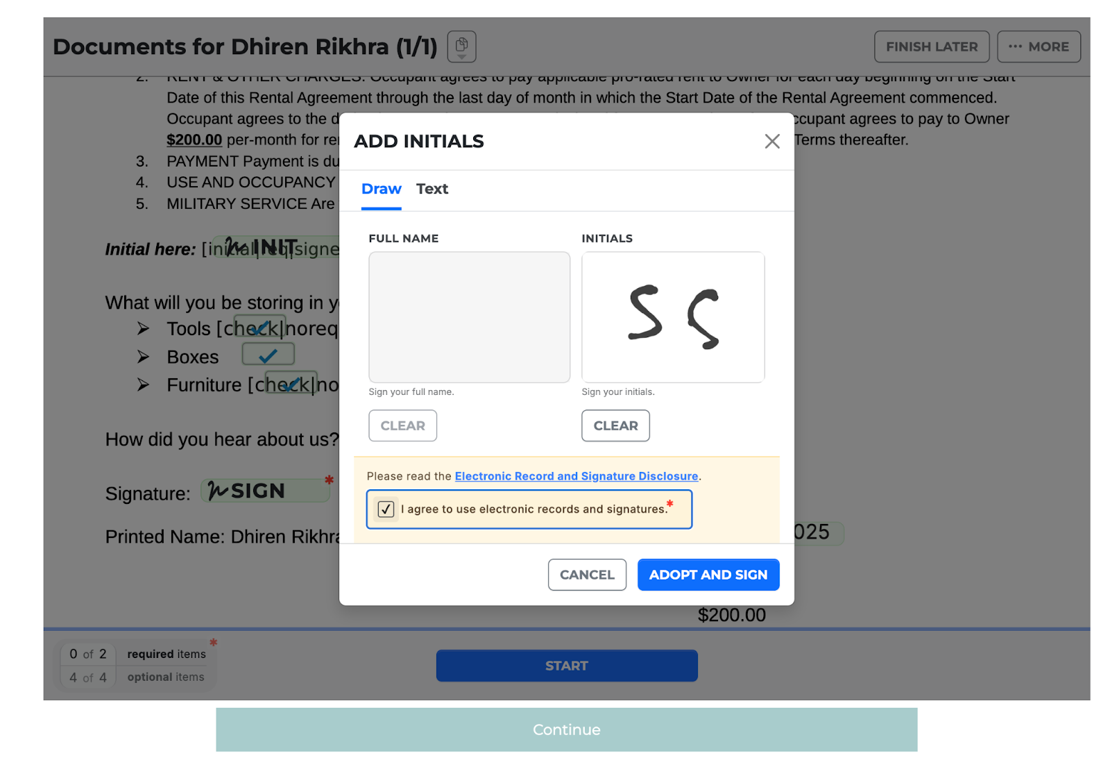 They will complete the eSign experience to sign their lease. Once signed, the customer will see a success message and click Continue.