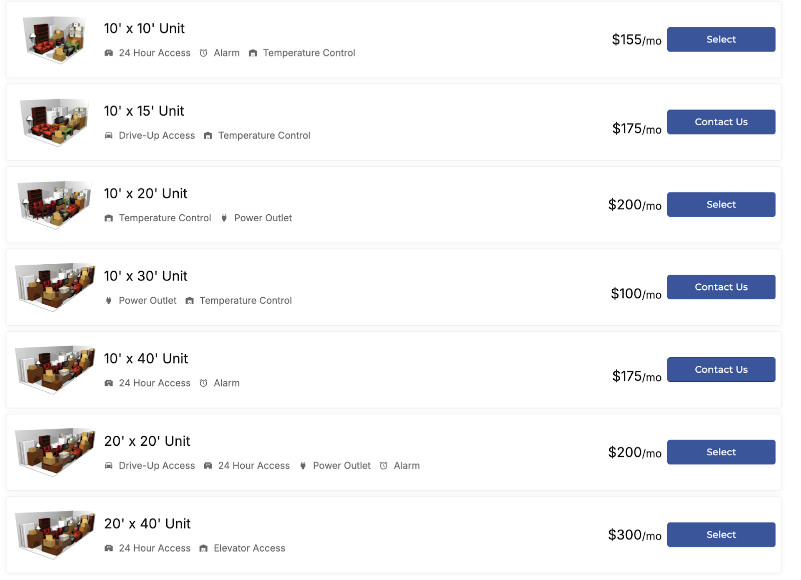 In this example, the customer clicks Select from the Units Table to choose what unit type they want.