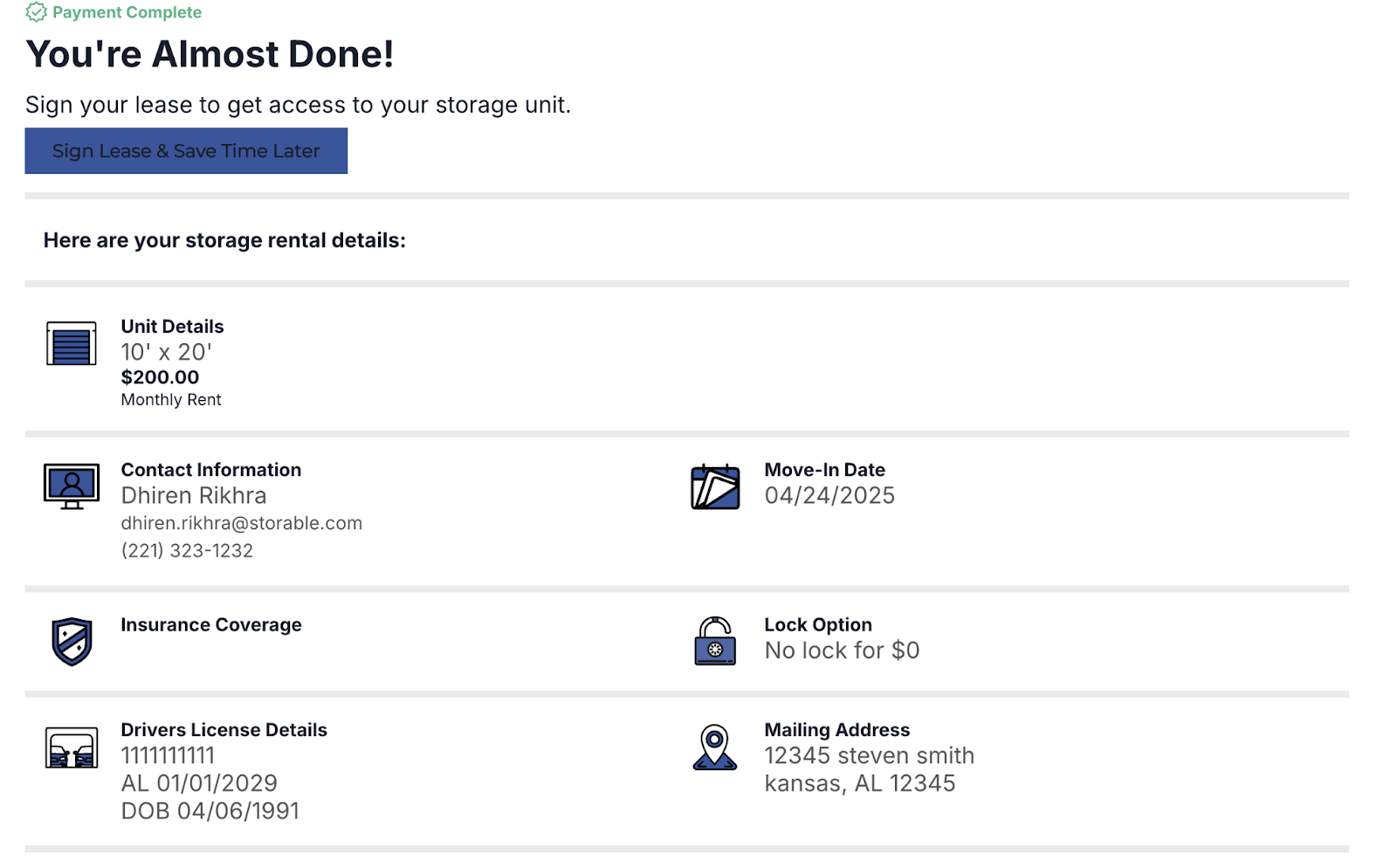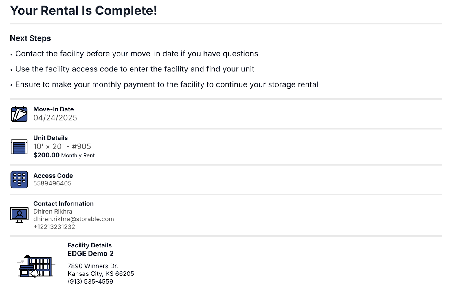 The customer will see an overview of their rental, including their access code or instructions to contact the facility for their access code, depending on your settings. They will receive this information via email as well.