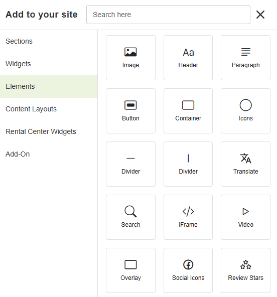 Elements such as images, text, and buttons can be added to layouts or sections by dragging and dropping them onto your webpage.