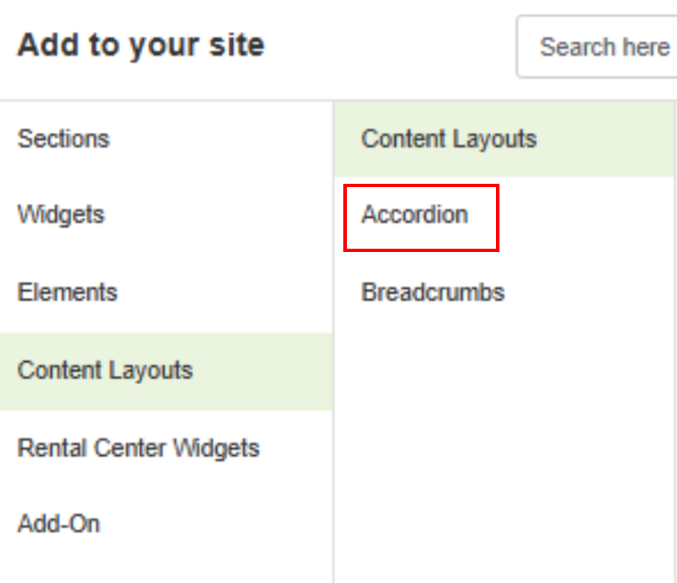 | To add the layout, drag and drop Accordion to where you want it on the page. | |