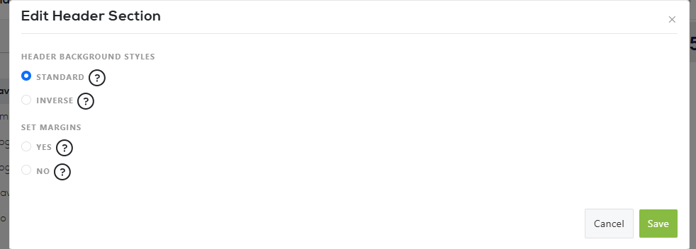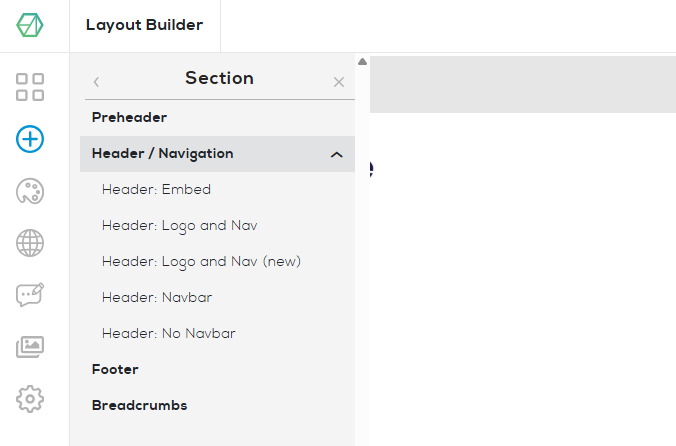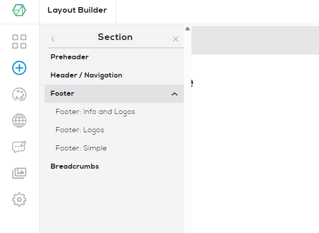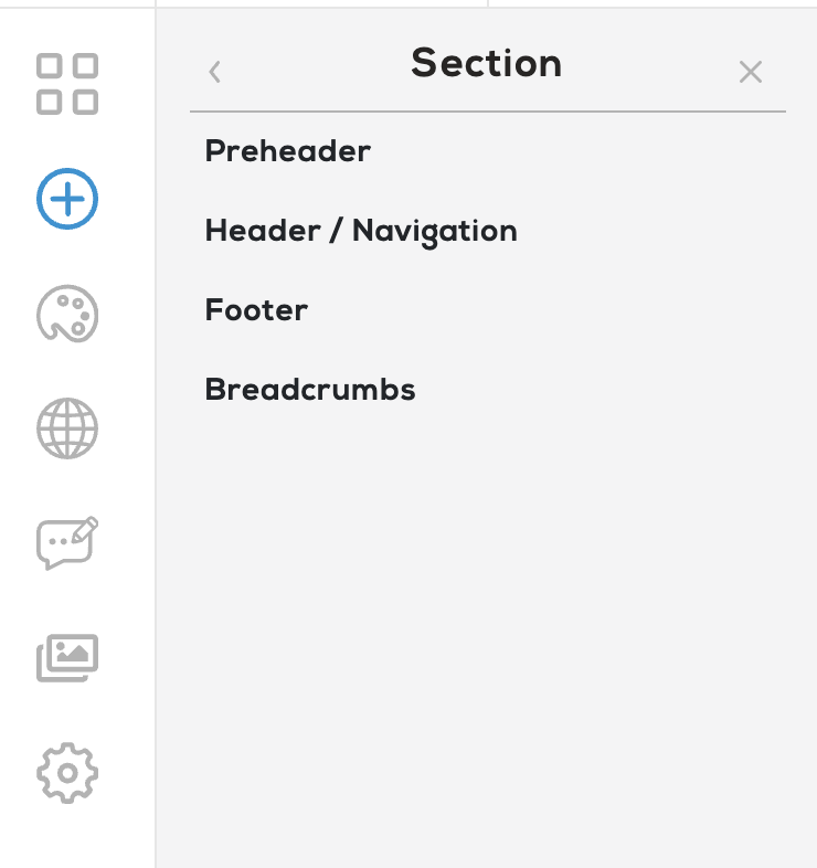 To add a new header or footer, click the plus sign in the menu on the left side of the screen. Then click Section.