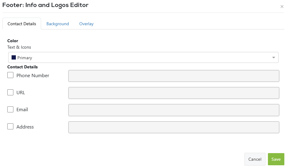 - You can change the background of the entire footer section to use colors (style colors, solid custom hex code, or gradients), images, or an embedded video.