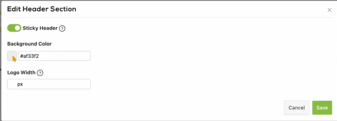 After adding one of these templates to a webpage, right-click the gear icon to toggle the sticky header setting and customize the background color and logo width.