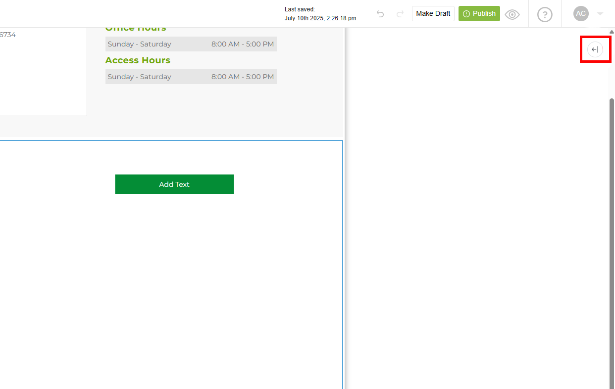 You can customize the properties of each Layout and Element on your webpages by editing your website content. To do so, click the button at the top right corner of the page to open the Properties panel of a layout or element.