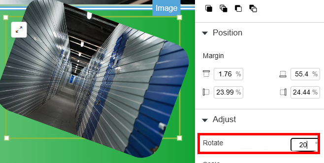 Rotate - Enter positive values to rotate the element clockwise up to 360 degrees (back to center). Enter negative values to rotate the element counterclockwise.