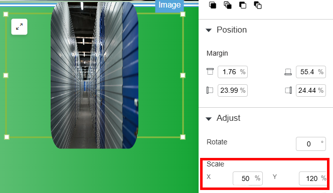 Scale - Enter the element's size as a percentage of the container. Please note: Entering values over 100% will cause the element to overflow the container.