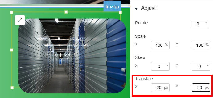 Translate - Enter a number of pixels along the X or Y axis to move the element within the container.