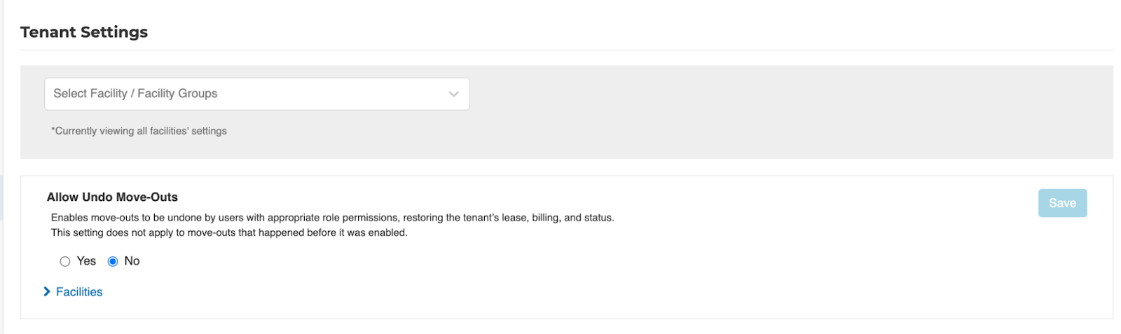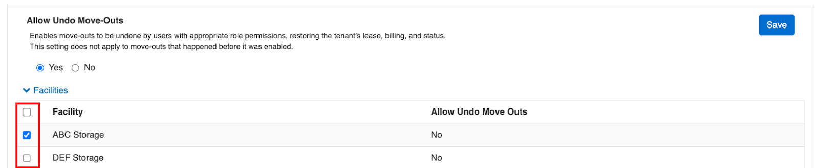 4. Under the Per-facility permissions section, check or uncheck Undo move outs. If All Facility Permissions is checked, is checked and you want to remove this permission from the role, you will need to uncheck that box first.