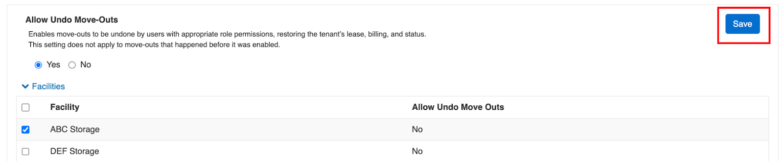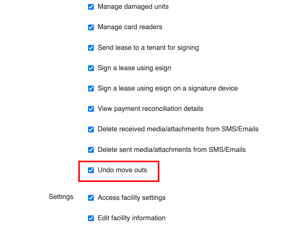 If Undo Move-Outs is enabled, users with permission can undo a move-out within the same day that it took place (up to 11:59 p.m. in the facility’s time zone). Learn more about how to Undo Move-Outs in our Help Article.