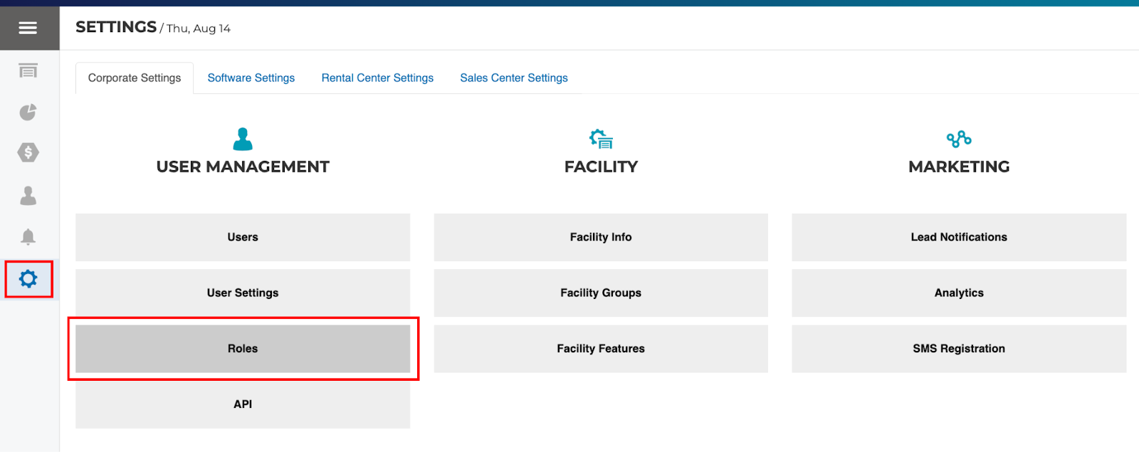 1. From the Corporate Level of your software, navigate to the Settings tab. 2. Click Roles. |
