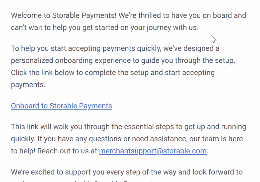 Once the Storable Team has activated your Payments account, you will receive an email with a link to complete onboarding. Click Onboard to Storable Payments to begin.