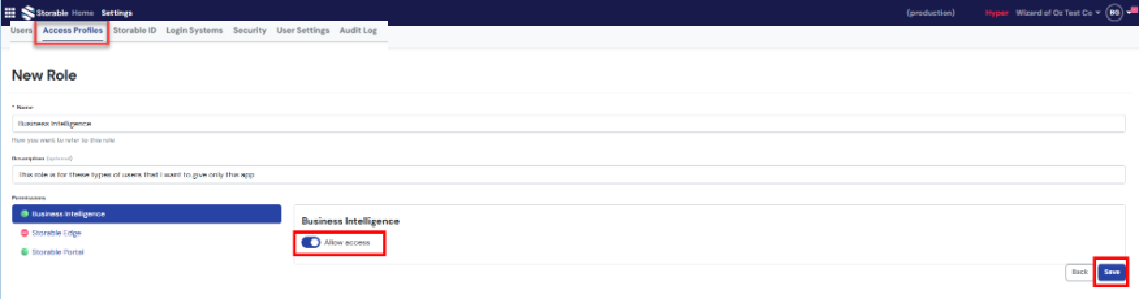 3. Under Permissions, select Business Intelligence and toggle on Allow access.
