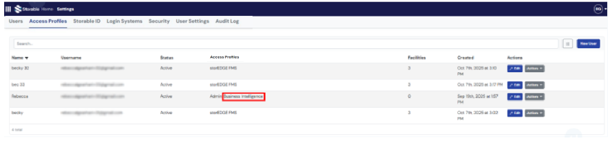 - The updated user will now show Business Intelligence under their Access Profiles column.