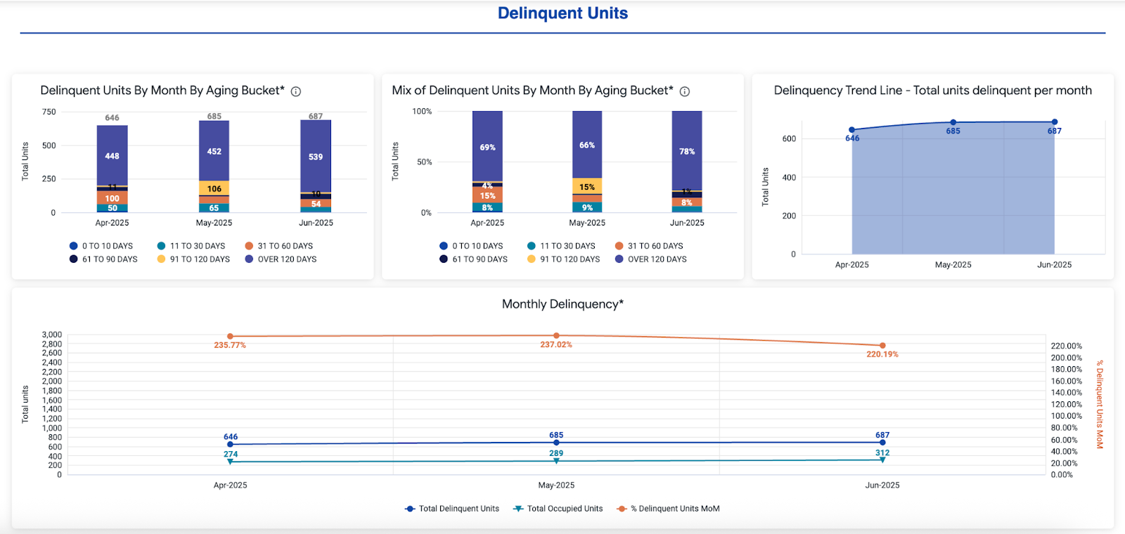 • Total Delinquent Units: Count of delinquent units/tenants as of the end of the month, by month. This metric is not dependent on first-of-month vs anniversary billing.