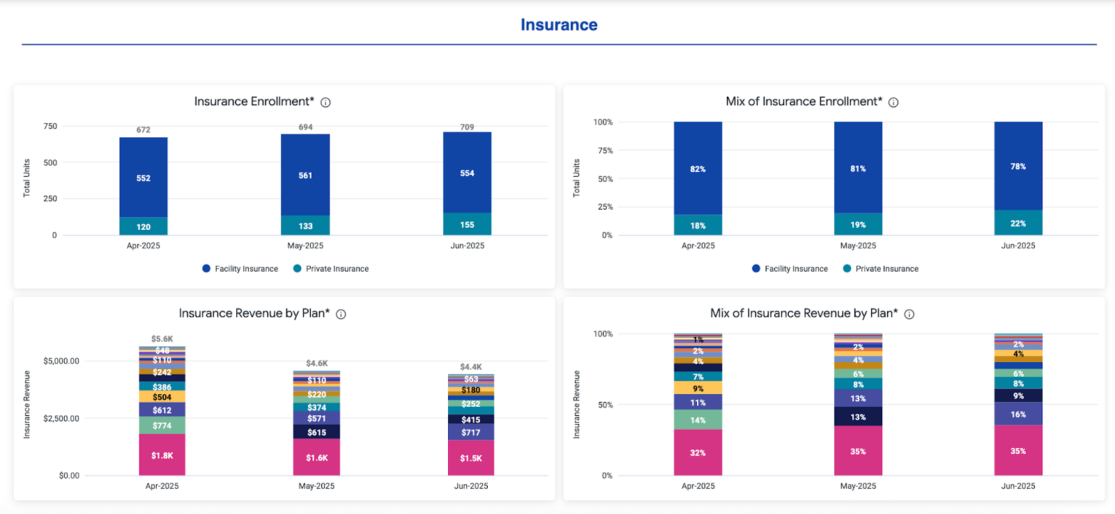 This report allows you to observe insurance enrollment status trends, helping you understand your insurance enrollment rate over time. Each bar represents a month and is segmented by insurance enrollment status.