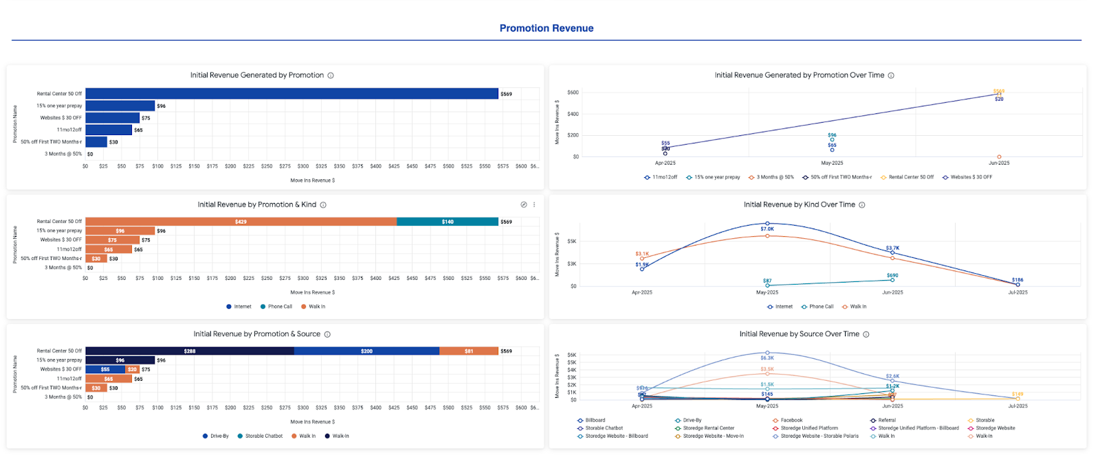 The Growth Reports dashboard highlights the impact of promotions on tenant acquisition and revenue. It surfaces trends in move-ins, revenue contribution, and length of stay across promotional offerings, helping you evaluate which campaigns drive the most value and retention.