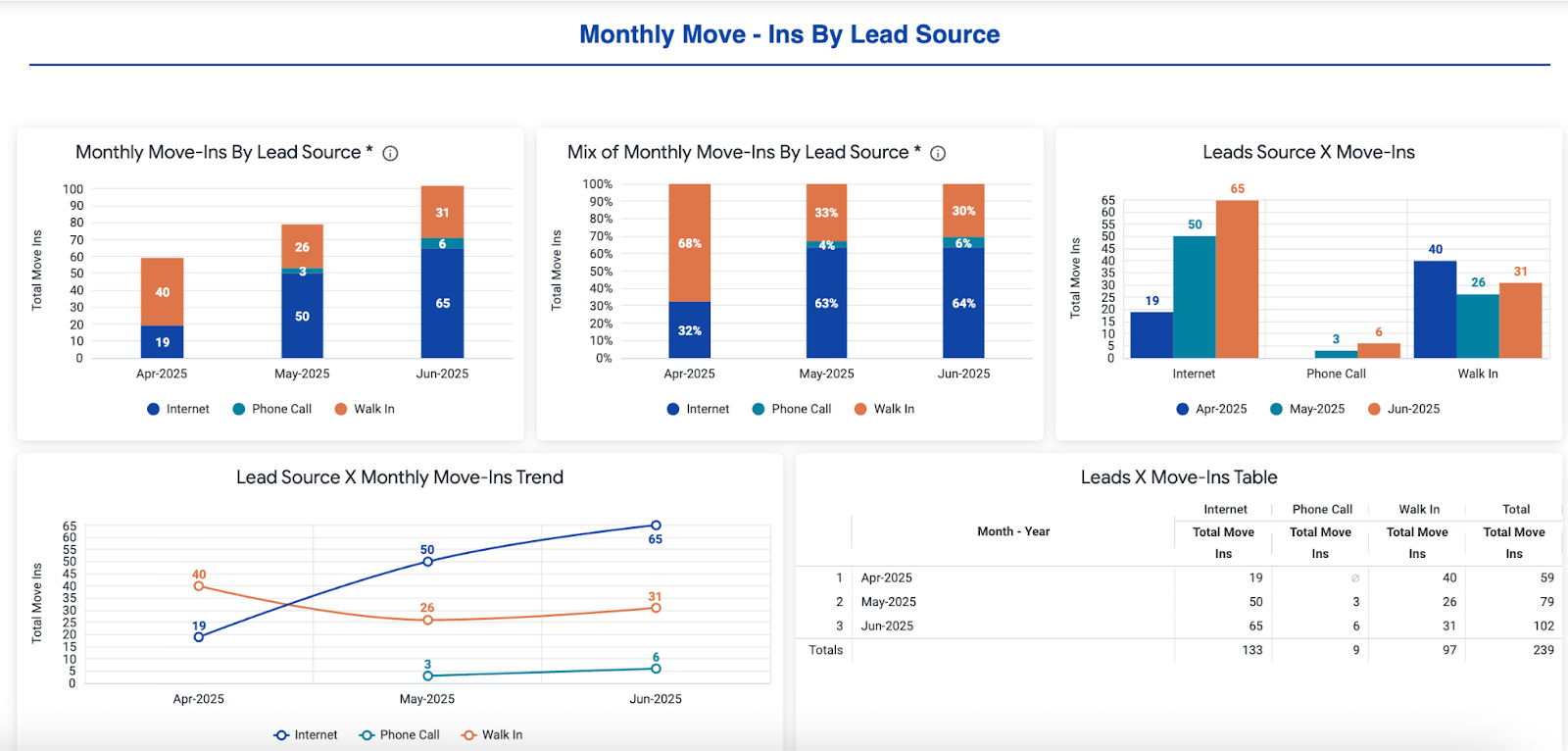 • Count of Move-ins / Source: Count of Move-Ins and Future Move-Ins per Lead Source per month.