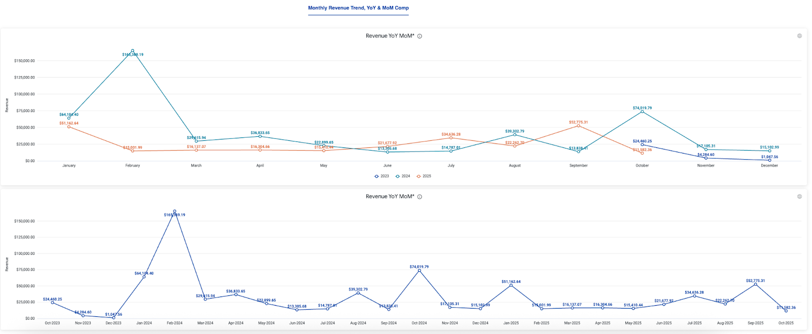 This report allows you to quickly identify revenue trends, seasonality, and performance comparisons across different time periods. It helps you understand growth and the impacts of past strategies.