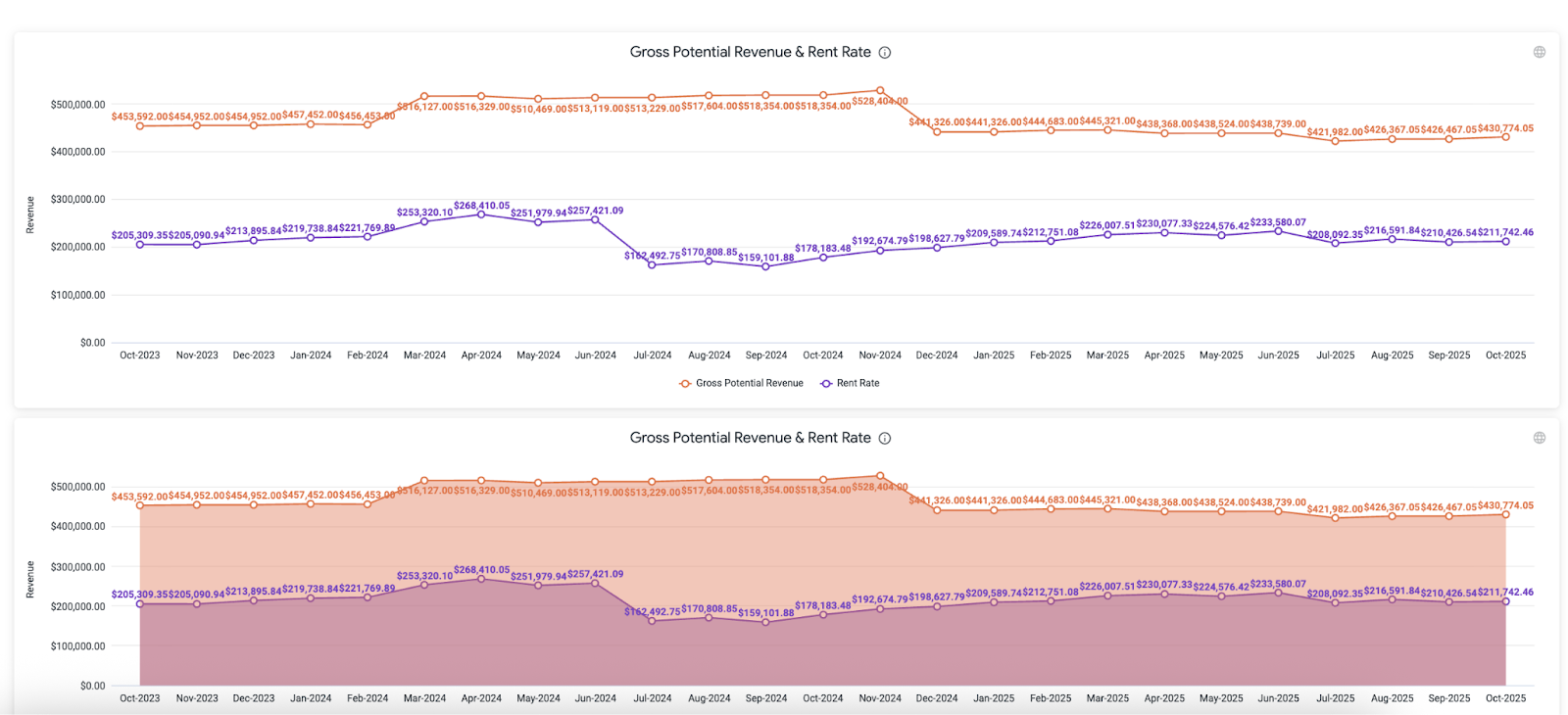 • Actual/Economic Rental Revenue ($) per month: Paid (Rent) Rate x Actual Occupancy (for the corresponding point in time)