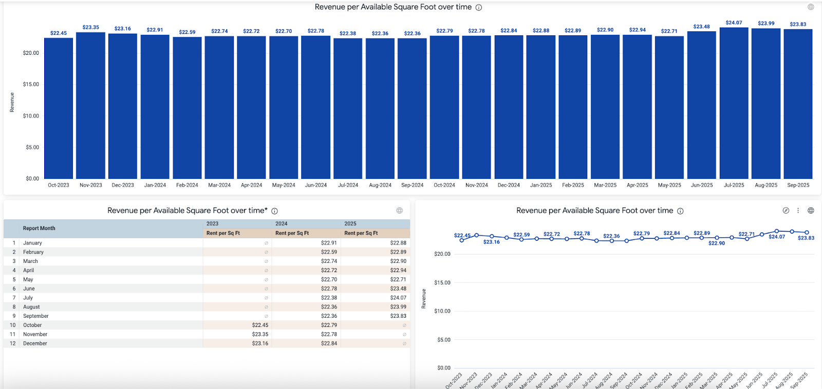 • Revenue Per Available Square Foot for each month over the selected time period (Unrentable units are omitted).