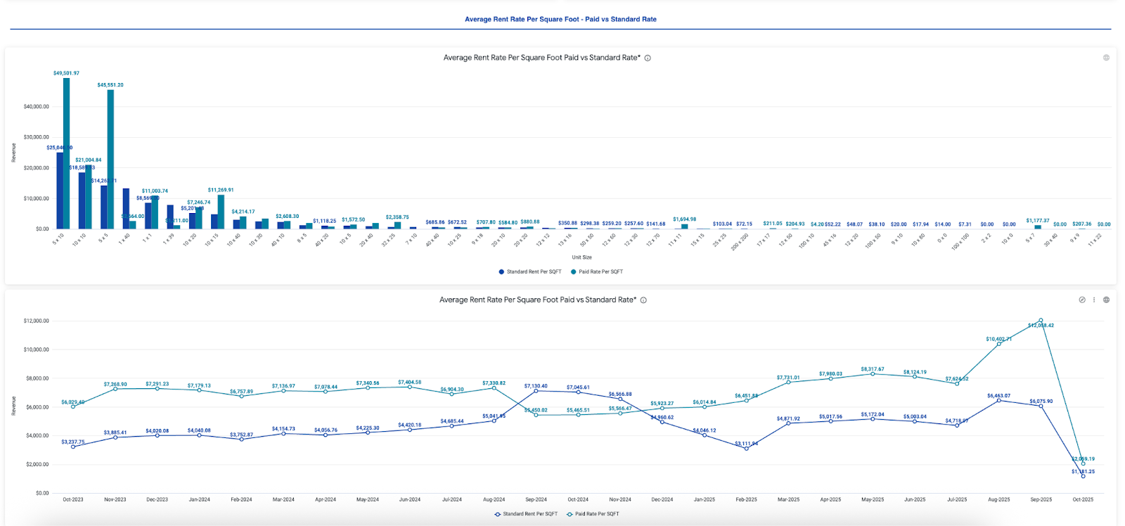 • Actual/Economic Revenue: For the selected time period, this is calculated as the sum of the actual paid rate of each occupied unit (specific to unit size) x number of units that were occupied during that time period (of that size).