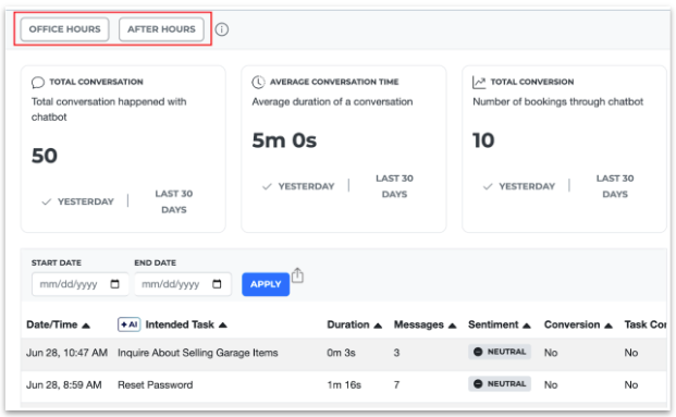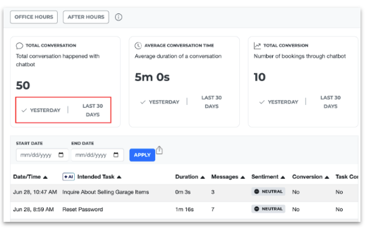 Key Metrics to Watch: Total Conversations: How many chats have come in? Total Conversions: How many of those chats resulted in a reservation? Sentiment: The overall tone of the chat (Positive, Negative, or Neutral). This helps you quickly gauge customer satisfaction. Task Complete: Was the customer's goal achieved, even if it wasn't a reservation? |