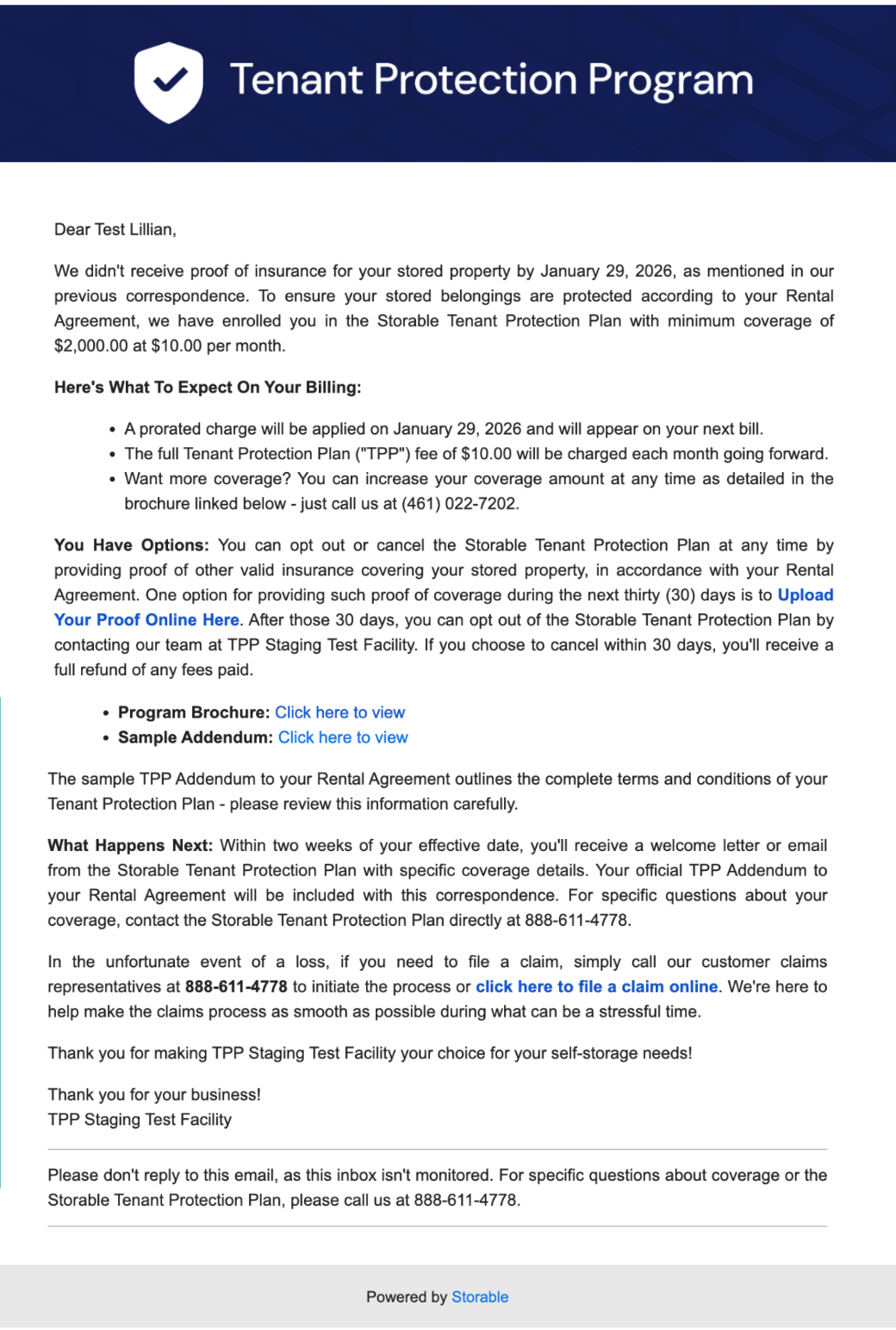 If the tenant does not provide proof of private insurance before the end of that time period, they will be automatically enrolled in your store’s lowest-cost TPP plan. They will receive another email at that point confirming their enrollment.