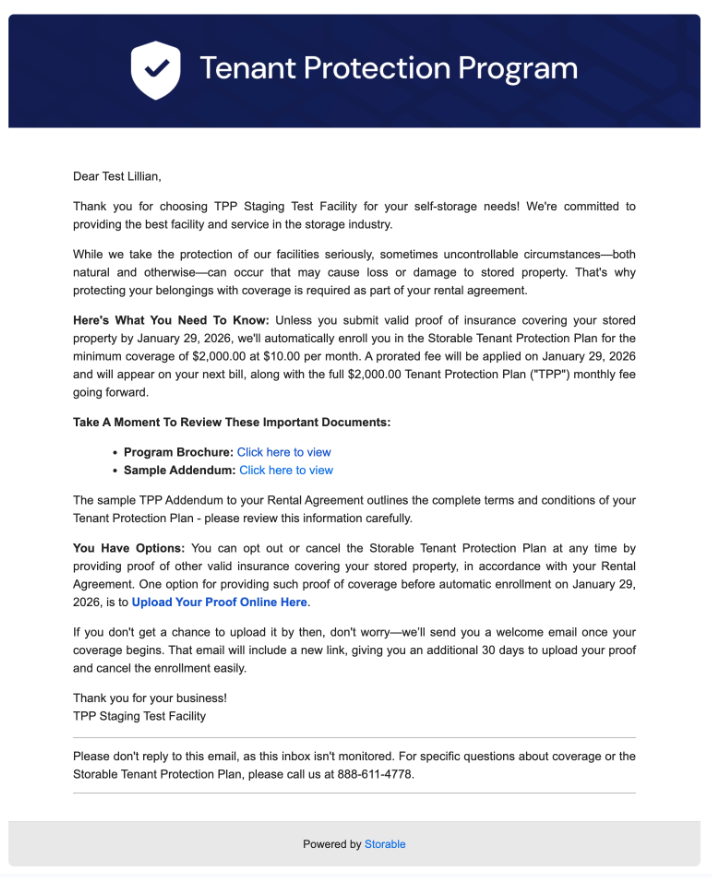 If tenants previously purchased coverage from your facility, our team will handle converting them to your new Storable Tenant Protection Plan. Tenants will receive an email notifying them of an upcoming change to their insurance provider and all the details they need about their new coverage. After 30 days, their coverage will be automatically switched on the date of their next billing cycle.