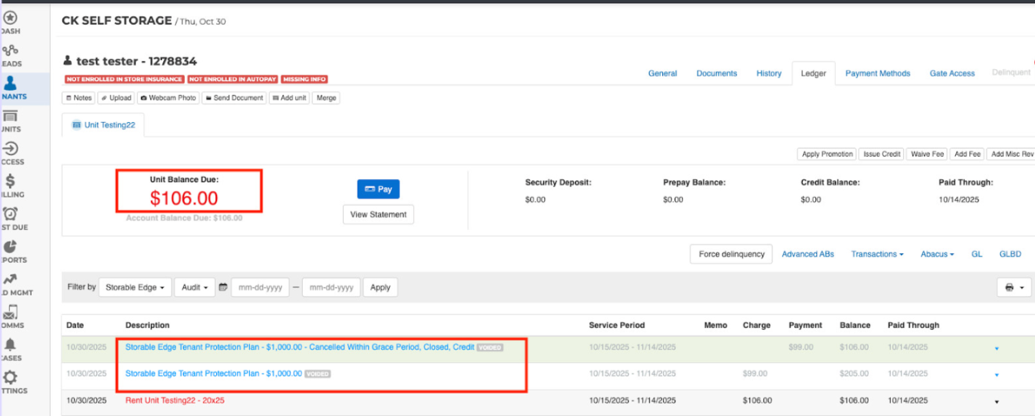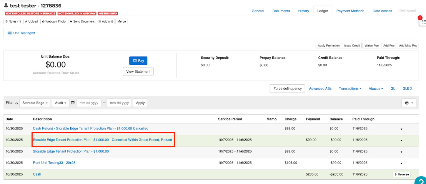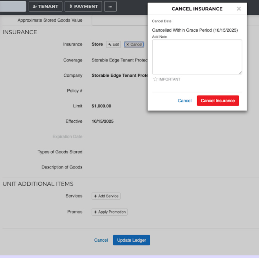 If a facility manager cancels TPP coverage, inputs the tenant’s proof of private coverage in Edge, and the tenant has not yet paid the fee, any pending TPP charges will be removed.