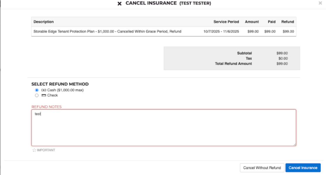 If a facility manager cancels TPP coverage by inputting the tenant’s proof of private coverage in Edge and the tenant has paid the fee, the fee will be refunded during the cancellation workflow.